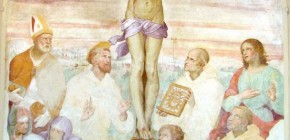 Nella grande tavola principale il posto d'onore, al centro, è dato dalla Crocefissione, di...