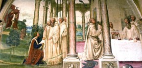 L’affresco che mostra la storia del Re Totila che vuole conoscere San Benedetto e manda a ...
