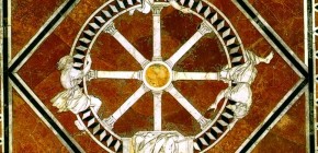 L'ultimo riquadro delle allegorie centrali rappresenta la Ruota della Fortuna, che lo stor...