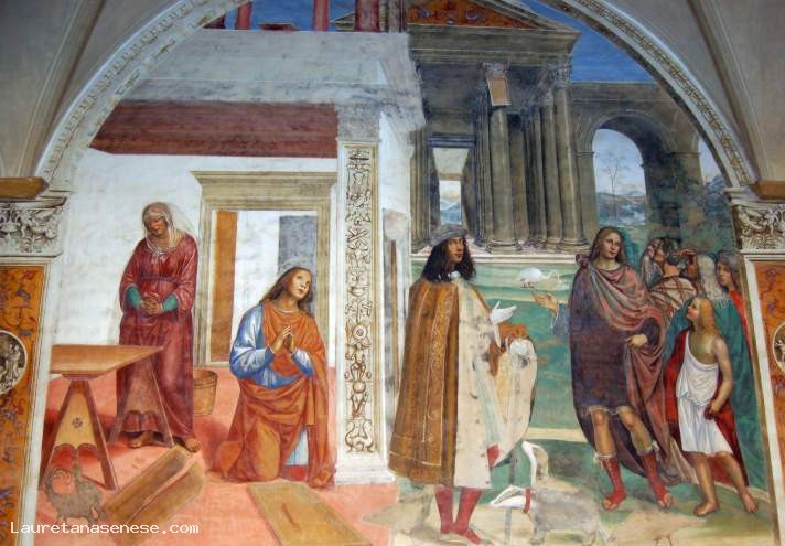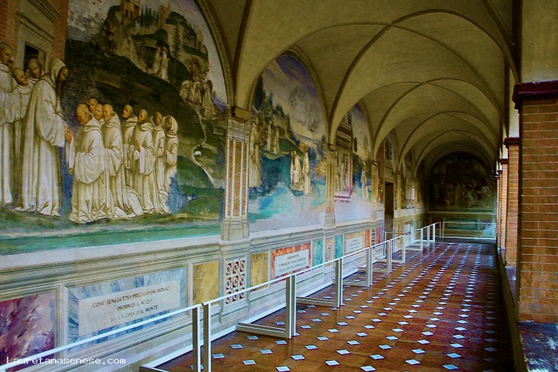 Il ciclo di affreschi che copre tutte le pareti del chiostro furono iniziati, prima dal Signorelli e completati dal Sodoma, in epoca successiva. Non è noto ad oggi il motivo per cui il Signorelli abbia abbandonato a metà quet'opera grandiosa. Si presume sia avvenuto per cogliere l'opportunità di commesse più prestigiose e forse meglio pagate.