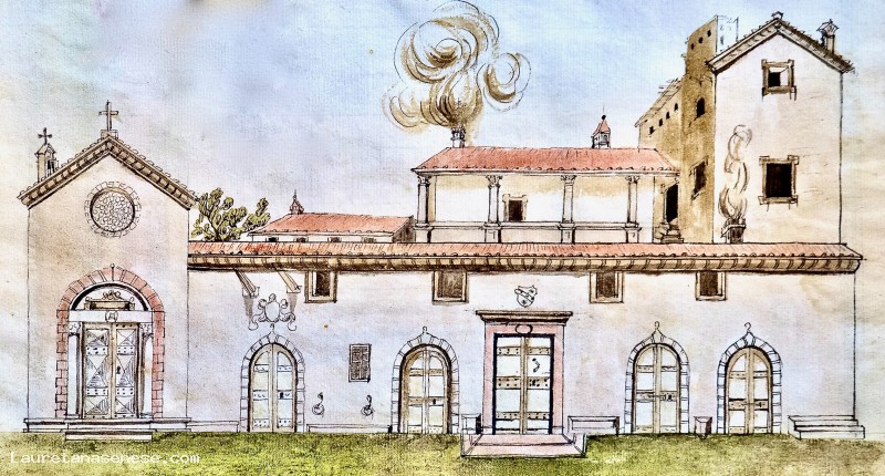 Questa immagine acquarellata, proviene dal Cabreo (inventario dei beni di proprietà dell'Ordine) redatto nel 1622 e ci regala una testimonianza sorprendentemente bella dell'intero isolato urbano occupato dal convento e l'annessa chiesa di San Giovanni, oggi conosciuta come San Bernardino.