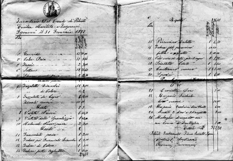 Tutto per un valore complessivo stimato di 317,30 Lire. Firmato da Ferdinando Petrioli, il padre di Emilia e da Giovanni Fagnani, lo sposo.