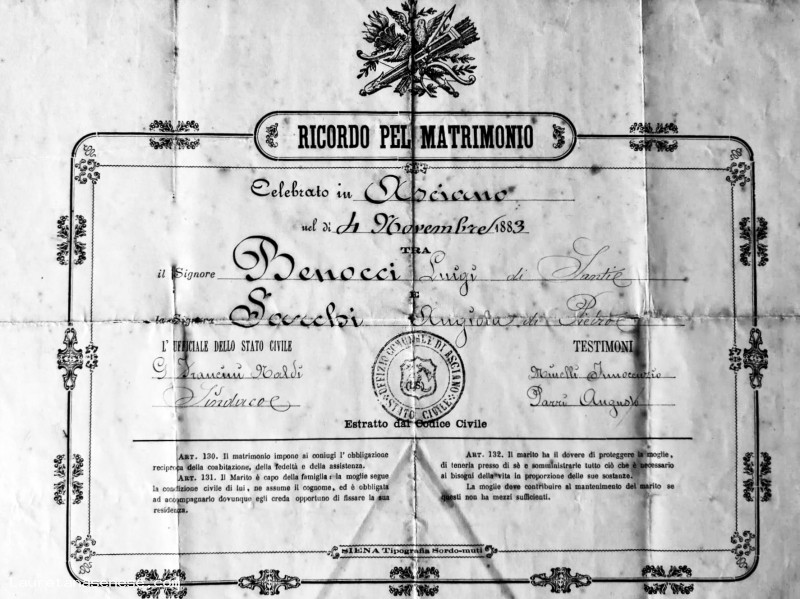 Il documento ci è stato fornito dal nipote dello sposo: Mauro Benocci, ascianese ora residente a Venturina, vicino a Piombino.