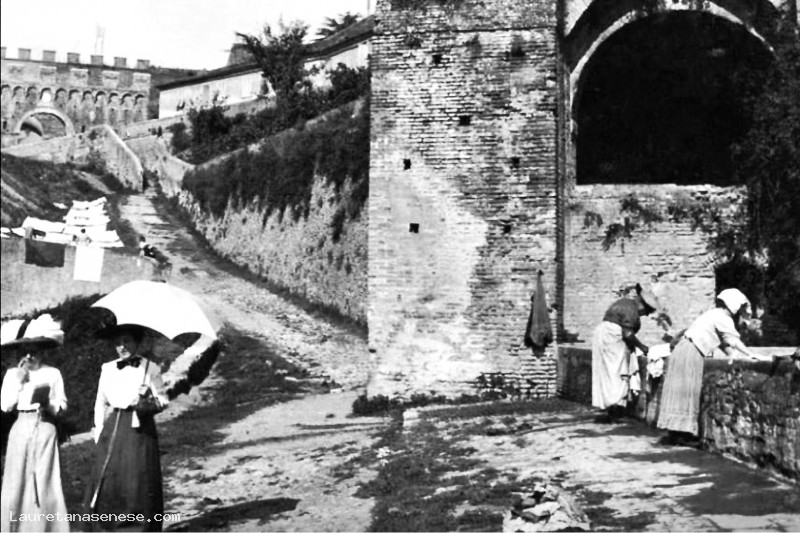 Vecchissima foto di quando le fonti costruite anticamente fuori da Porta Ovile, per utilizzare l'acqua che vi sgorgava, erano ancora utilizzate.