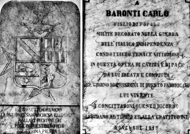 Le due targhe marmoree, tuttora visibili all'interno della Residenza Sociale Assistita di San Francesco, testimoniano il momento di inizio e fine della costruzione dell'edificio che avrebbe dovuto ospitare l'Ospedale Regina Elena, fortemente voluto dal garibaldino Carlo Baronti e finanziato in parte dalla Marchesa Elisabet Mallaby Pieri Nerli.