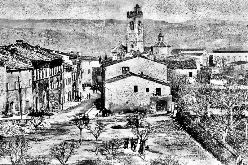 Sulla sinistra si nota il palazzo Spannocchi piuttosto mal ridotto e dotato di un pozzo, successivamente demolito.