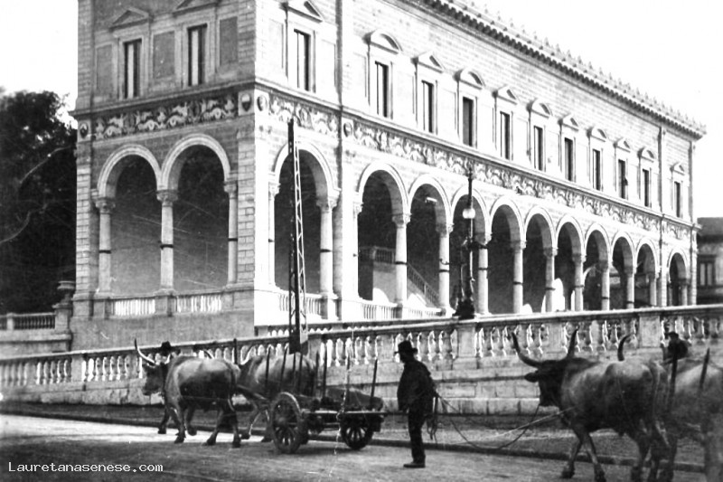 Infatti, mentre su via Tozzi transitano carri da traporto trainati da buoi maremmani, sul maciapiede si nota chiaramente un traliccio di sostegno della rete aerea a supporto deli Filobus che a quel tempo circolavano a Siena: da Fotebecci a Valli.