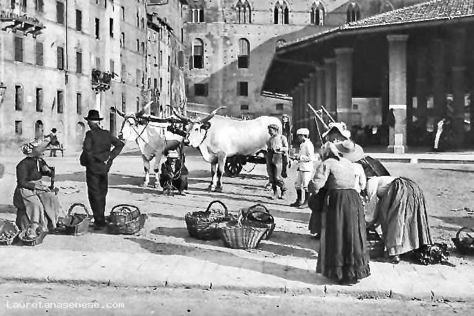 Oltre che a piedi, chi stava più lontano o aveva molto materiale da trasportare, raggiungeva la piazza con carri trainati da buoi maremmani.