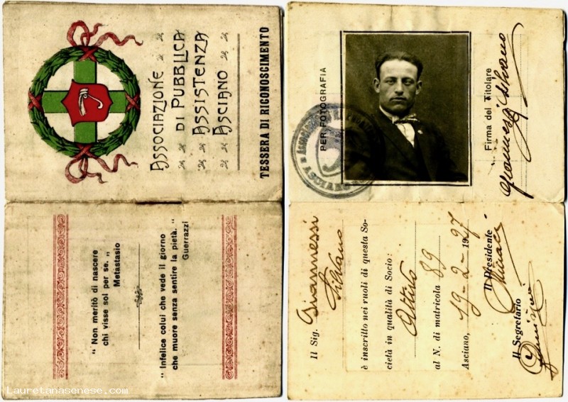 1927 - Tessera della PUBBLICA ASSISTENZA Asciano