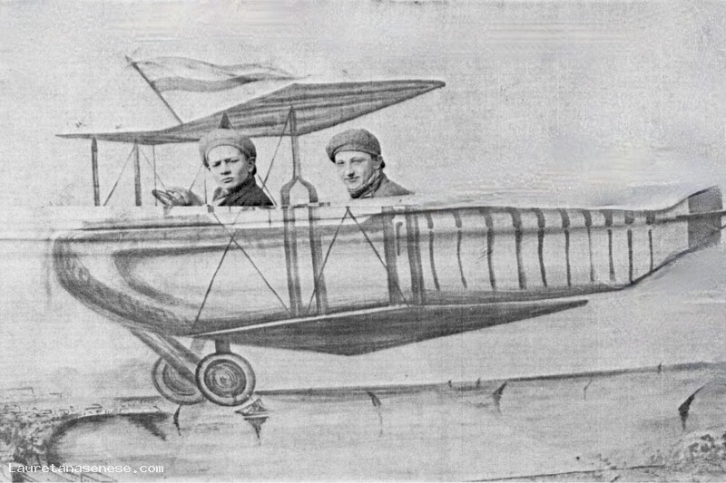 Due giovani ascianesi si sono fatti ritrarre a bordo di un aereoplano disegnato su un telone. Nel telone esistevano due buchi dove infilare la testa, giusto il tempo per una foto con la lastra. Le persone titratte sono, da sinistra: Ferdinando Dotti Aldo Paci, detto "Il Sisse" La sorte ha voluto che suo figlio Giacomo abbia coronato il sogno di volare al posto suo, avendo lavorato come dipendente Alitalia a bordo di aerei di linea.