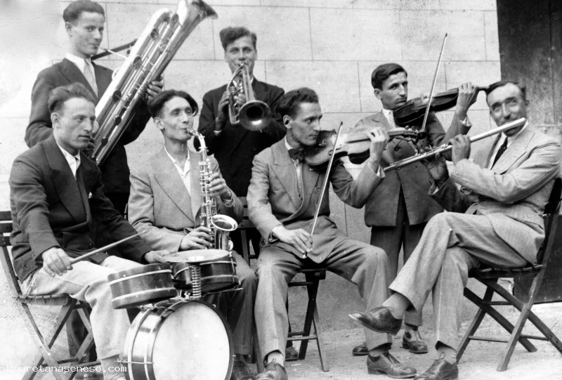 Un'orchestrina di amici immortalata nel 1933. Ovviamente un gruppo del genere rappresentava allora, come sempre succede, il massimo della modernità ed era formato in prevalenza da giovani che, pur suonando nella banda del paese, intendevano cimentarsi nell’esecuzione di musica più moderna.