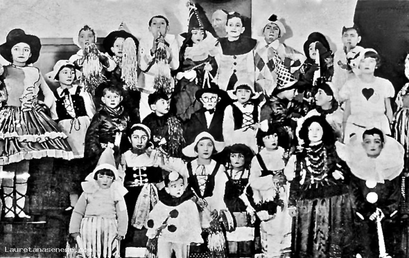 Maria Luisa Paci mamma di Gianfranco Sonnimini, sulla sinistra con un grande cappello, Enrico Torpigliani, vestito da Pierrot, in basso al centro