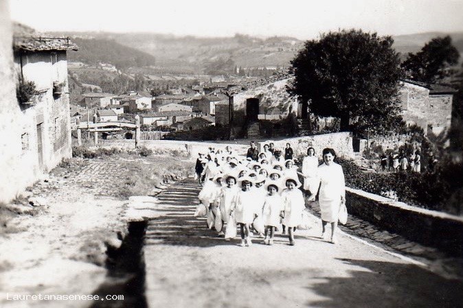 Gita in paese dei bambini della Colonia Estiva al loro rientro lungo la salita di S.Francesco. Sullo sfondo il Podere di San Marco con il giogo per la ferratura degli animali.