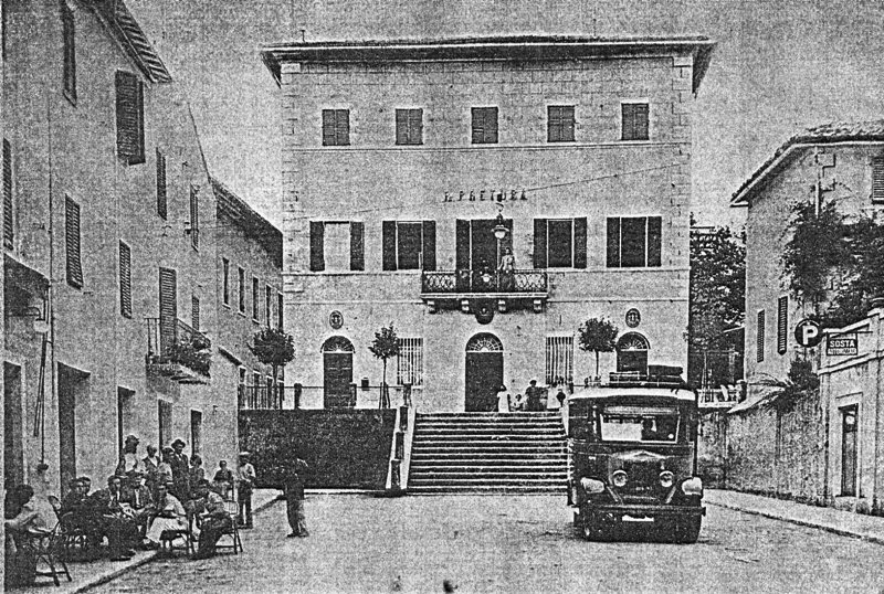 [1935 - 1940] Già prima della guerra e fino agli anni '60 c'era il "Postale del Fei" che faceva servizio di trasporto persone e sacchi postali da Piazza Garibaldi a Siena in Piazza Matteotti. Questa foto ne testimonia la partenza. La Pretura ha ora il terrazzo ed il tetto a spivente, non più a capanna.