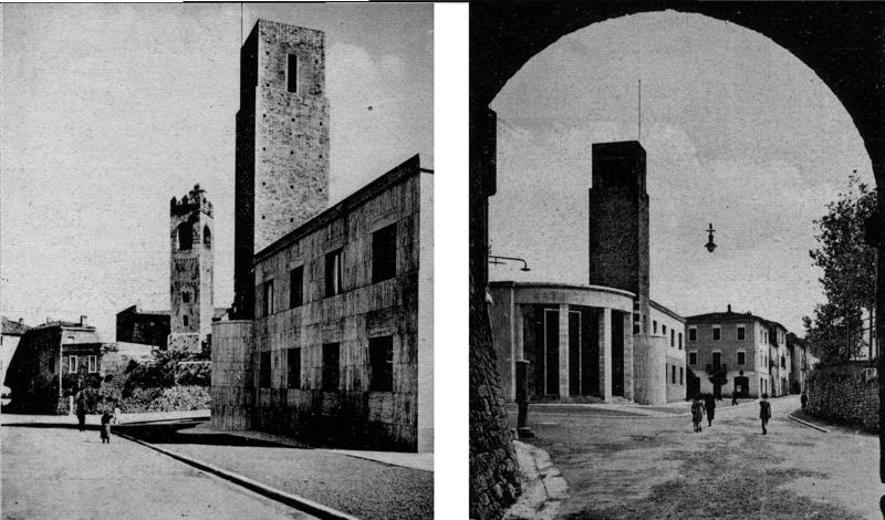 La prima foto ritrae la Casa del Fascio ripresa da Prato. Si notano i marciapiedi e la strada in terra battuta imbrecciata. La seconda foto è stata scattata dalla galleria di Porta Massini che separava il portone esterno da quello interno. Sulla sinistra si nota ancora la colonna della benzina e nell’edificio d’angolo di via Roma l’insegna della tabaccheria Capperucci, oltre alla terrazza al primo piano.