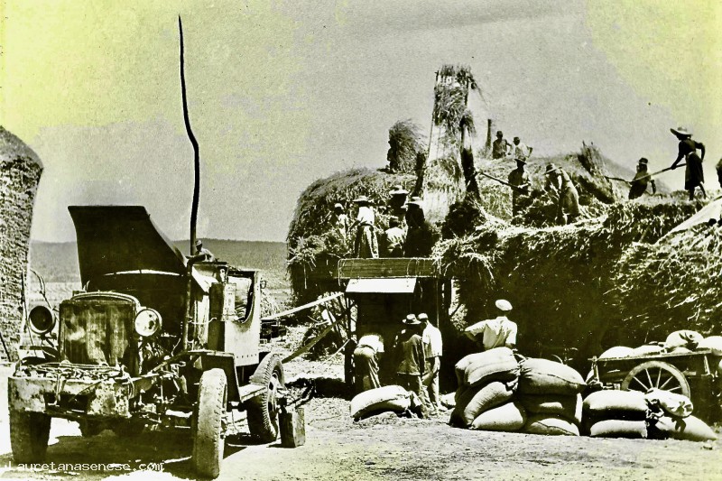 Trebbiatura al podere del Balloccio, subito dopo guerra.