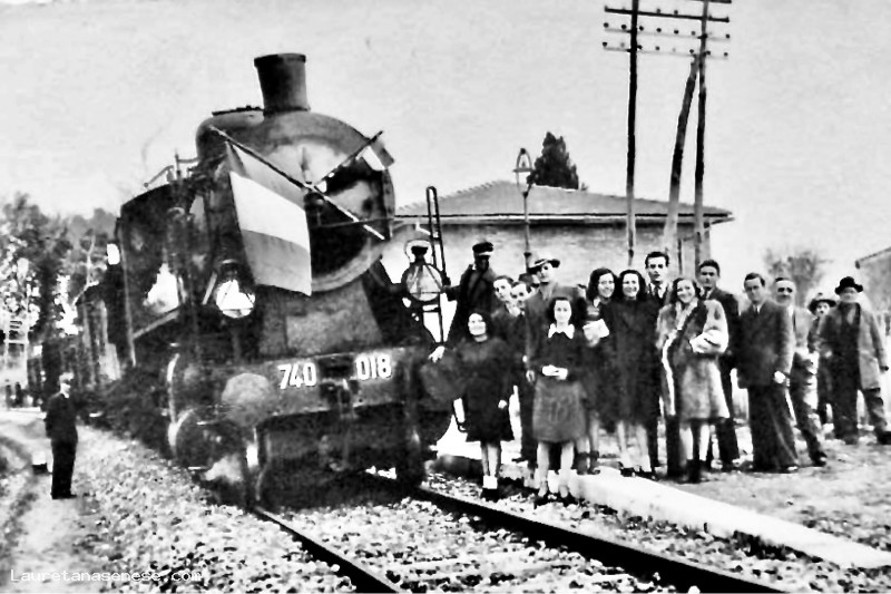 In questa foto, il convoglio di collaudo, adeguatamente zavorrato per collaudare ta tenuta dei ponti ai carichi pesanti, si ferma ad Asciano San Giuseppe per una foto ricordo.
