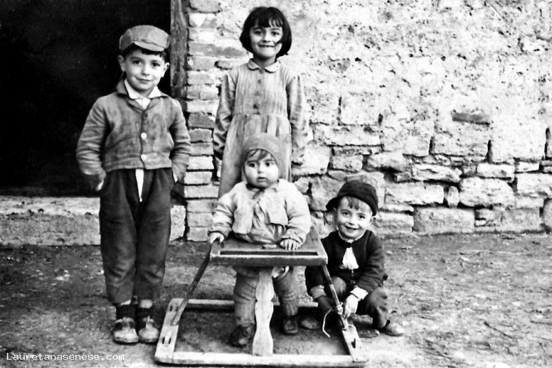 Una caratteristica particolare di questa foto, è il girello di legno che serviva per lasciar libero di muoversi un bambino non ancora in grado di muoversi in autonomia.