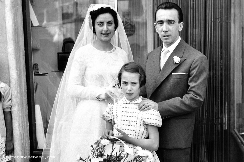 1958, domenica 31 agosto - Gli sposi davanti alla bottega dello zio Asciano