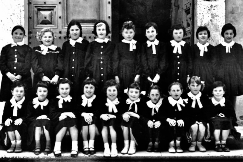 Alunni da sinistra in alto: Anna Voltolini, Maria Erina Giulietti, Chiara Bechi, Simonetta Tognazzi, Angiolina Stolli, Liria Pietrelli, Ivana Farinelli, Liana Sadotti, Lina Donati, Mirella Palazzi, Silvia Rossolini, Loredana Stopponi, Nara Soldati, Franca Mariotti, Alida Betti, ? Decicco, ? Decicco, Marcella Bari.