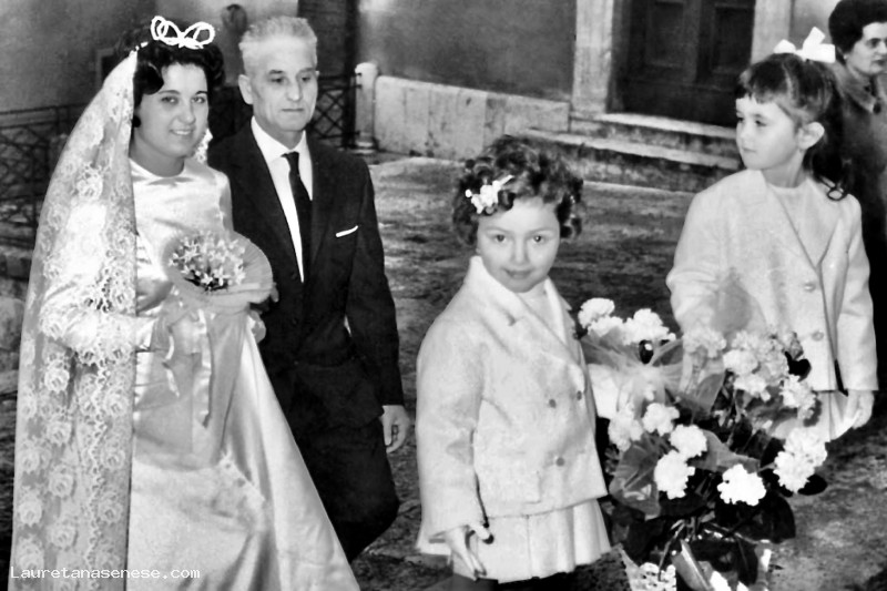 La sposa sulle scale della chiesa, accompagnata dal babbo, Gino Meioni e preceduta dalle damigelle: Michela Barbi e Luana Meioni.