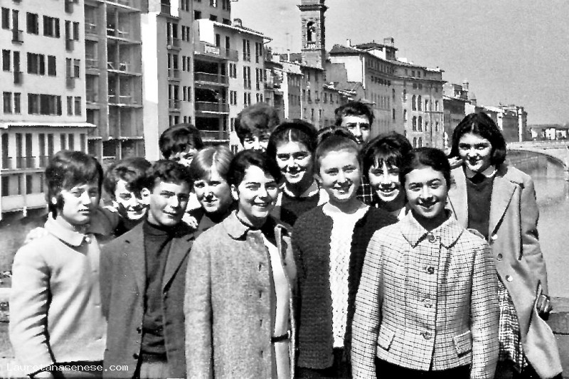 Ragazze e ragazzi in gita scolastica, forse sul lungarno a Pisa.