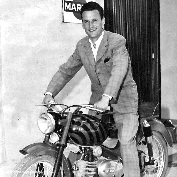 Valdemaro Giusti, detto il Massei, appassionato tifoso di calcio. Fotografato a cavallo della sua moto (Benelli?) con il serbatoio dipinto a strisce nere e blu.