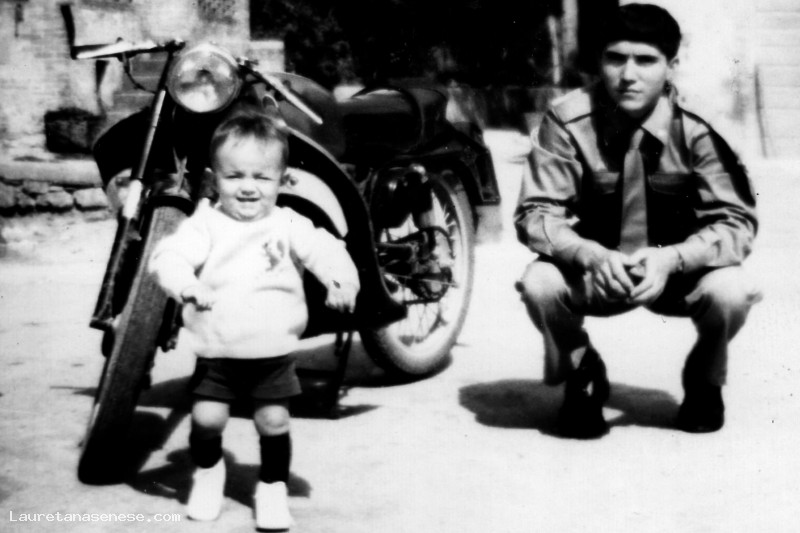 Alberto Tognaccini in divisa militare con il nipotino: Fabrizio Barbagli di poco più di un anno, fotografati accanto alla sua moto, nell'aia del Palazzo.