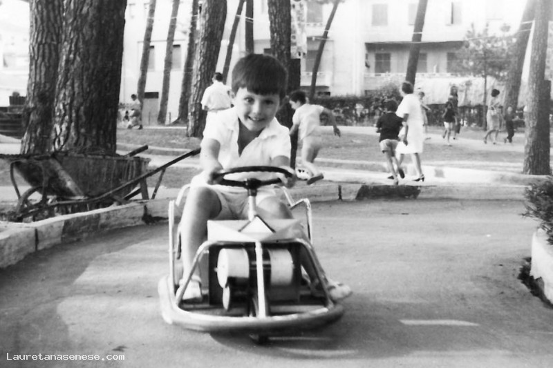 Pineta centrale di Follonica, attrezzata con giochi per bambini: Umberto Mancini gira in pista con la macchinina elettrica.