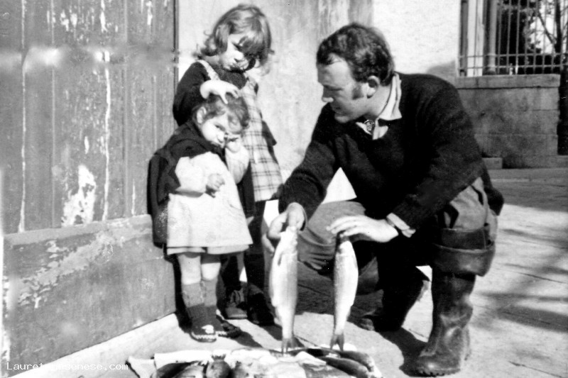 Contento della pesca fatta, Mario mostra i pesci catturati alle figlie: