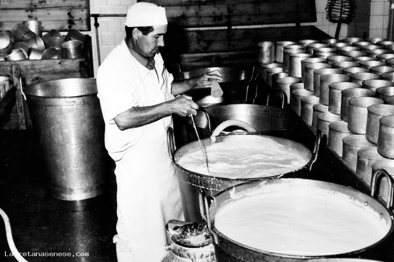 Questa importante fase per la produzione del formaggio pecorino è stata fotografata all'interno del Caseificio Ascianese che, in passato, si trovava sulla destra, lungo la strada del Lecceto, poco dopo il passaggio a livello di sant'Anna.