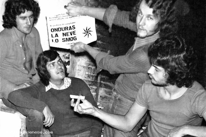 Qui si vede un gruppetto di ragazzi che allora venivano definiti "fricchettoni", per dire che si sentivano trasgressivi e contestatori della società del tempo.