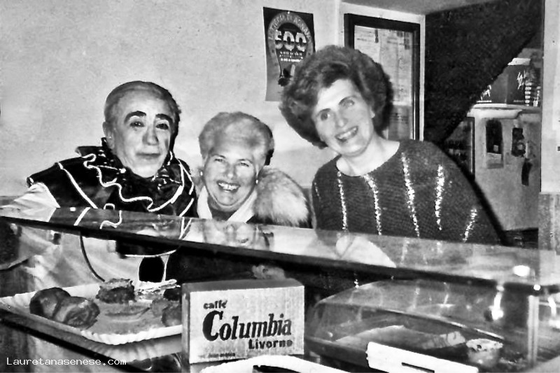 Ritratto di tre personaggi ascianesi dentro il bar Hervè in periodo di carnevale, da sinistra: