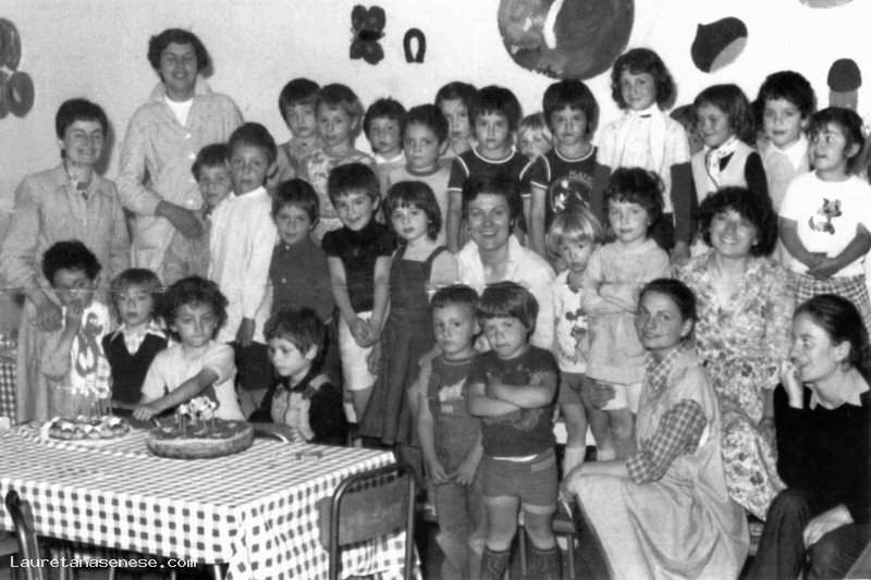 I bambini della Scuola Materna in gruppo con le loro maestre. Fra le maestre si riconoscono: