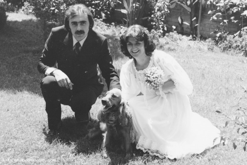 il giorno del loro matrimonio sul prato di casa con il loro amato cagnolino.