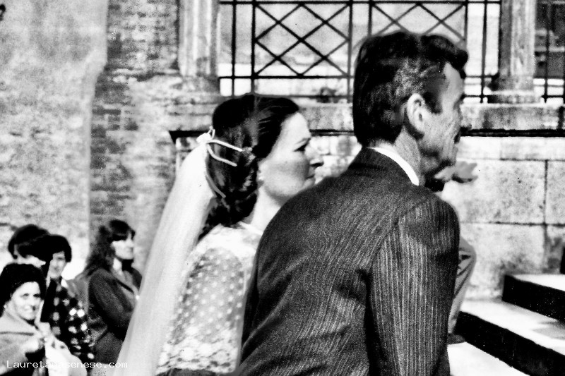 La bella Luciana Magini, accompagnata dal padre Alvaro verso l'altare di Sant'Agata, per sposarsi con Massimo Sestini, originario dell'aretino.