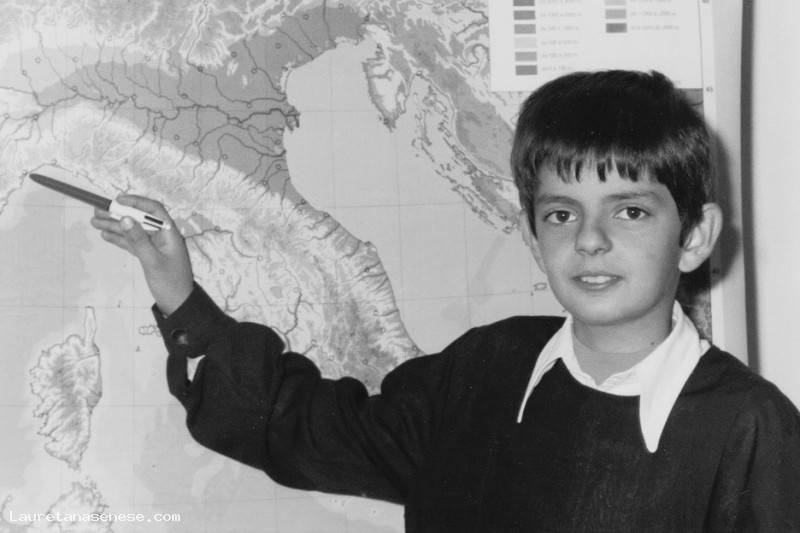 Paolo Cresti, ritratto a scuola mentre descrive la cartina dell'Italia, in Quinta Elementare. Classe del Maestro Mauro Fratagnoli.