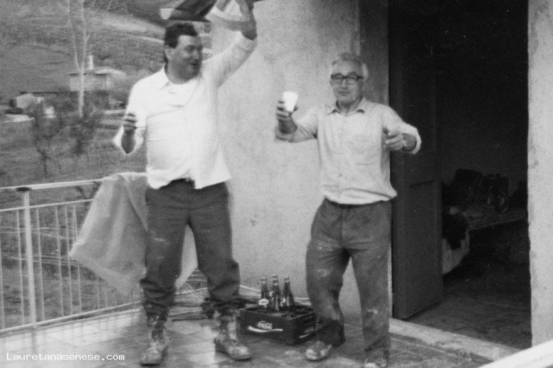 Gigi Fagnani e Osvan Soldati, festeggiano il termine della vendemmia, davanti al capanno di campagna.