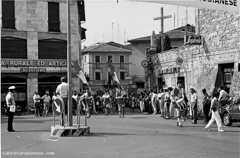 1985 – La comparsa della Corona in uscita da Porta Massini Asciano
