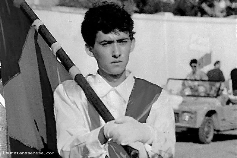 Un giovanissimo Carlo Fratagnoli che sfila lungo l’anello dello Stadio Marconi, precedendo la Jeep con carrozzeria di plastica “Citroen Mehar” rossa, su cui hanno trovato posto alcuni esponenti della contrada.