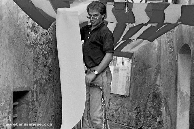 Riccardo Biagi sullo scaleo che prepara l’addobbo per la cena, realizzando un soffitto provvisorio fatto di striscioni di carta giallo-rossa.