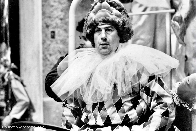 Renato Bernini di Camparboli, vestito da Arlecchino, alla guida di uno dei trattori per il traino dei carri di cartapesta.