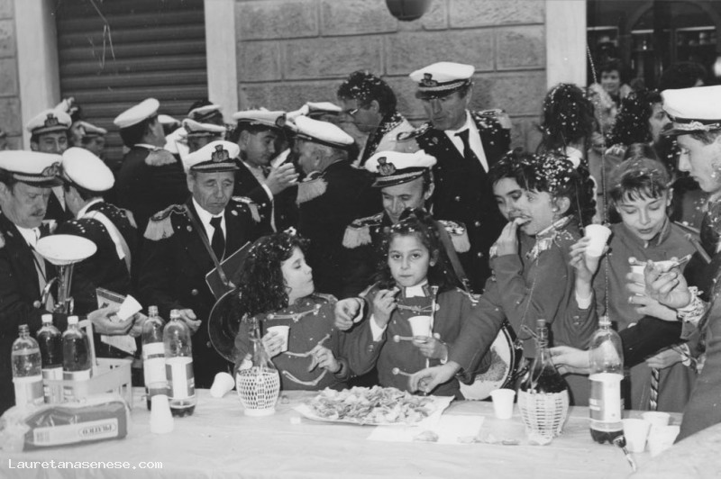 Abbuffata collettiva di Majorette e Musicanti intorno al banchetto dei crogetti e del vinsanto, sotto la torre dell'orologio.