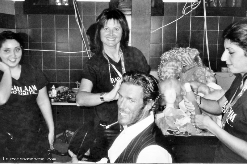 Luciana Giorni e le sue collaboratrici, intente a sistemare la capigliatura di un bel giovane: L'uomo dovrebbe essere il corridore di biciclette: Cipollini e il contesto in cui opera Luciana: un camerino di acconciatura della RAI a Roma.