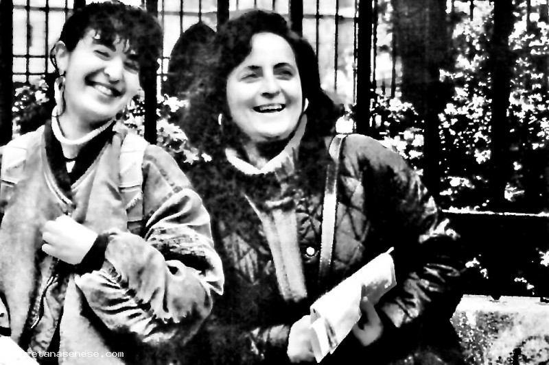 Miranda Fedi con la figlia Paola Romi ritratte davanti alla cancellata dell'Università Parigina della Sorbona.