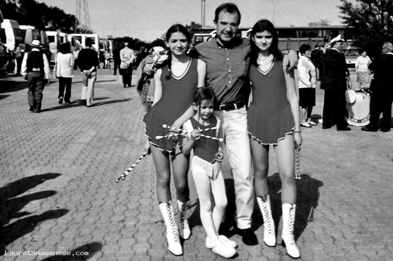Alberto Coradeschi, al seguito della Filarmonica Giuseppe Verdi di Asciano in trasferta a Mirabilandia, è circondato da Majorette speciali, le sue tre belle figlie: