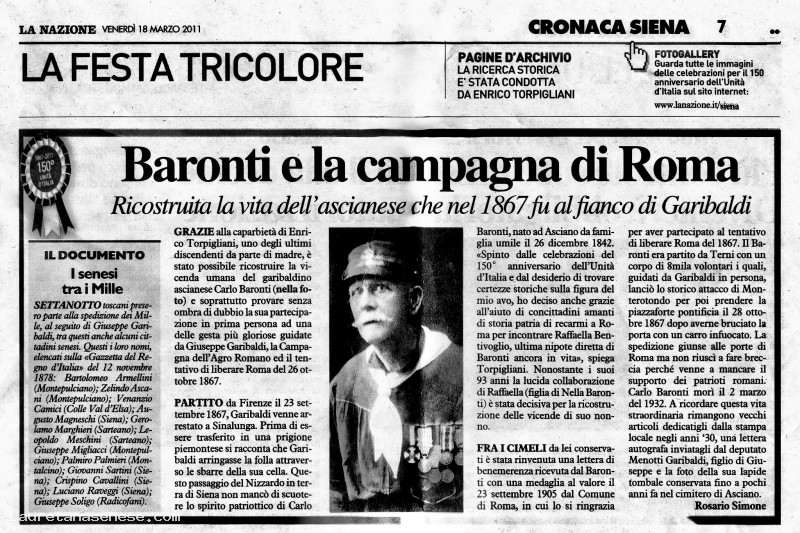 Nel 150° dell'unità d'Italia (17 marzo 1861), è stata ricordata la storica figura di Carlo Baronti, volontario garibaldino ascianese.