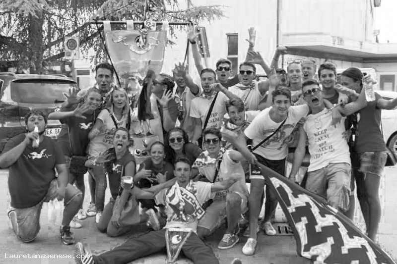 I sostenitori della Contrada della Tranquilla festeggiano il Palio vinto, facendosi immortalare tutti insieme con il "Cencio".