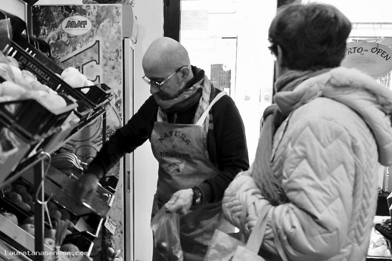 Alberto Batignani, nel suo negozietto: NATURA e DELIZIE, intento a servire una cliente che gli ha richiesto della frutta.