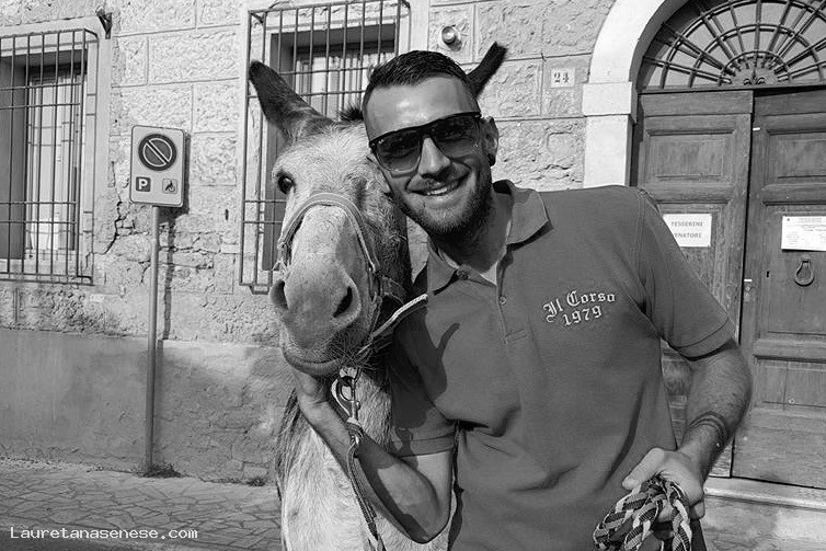 Un sorridente Gianmichele Crispino, immortalato assieme al ciuco che la sorte gli ha assegnato per correre il Palio.